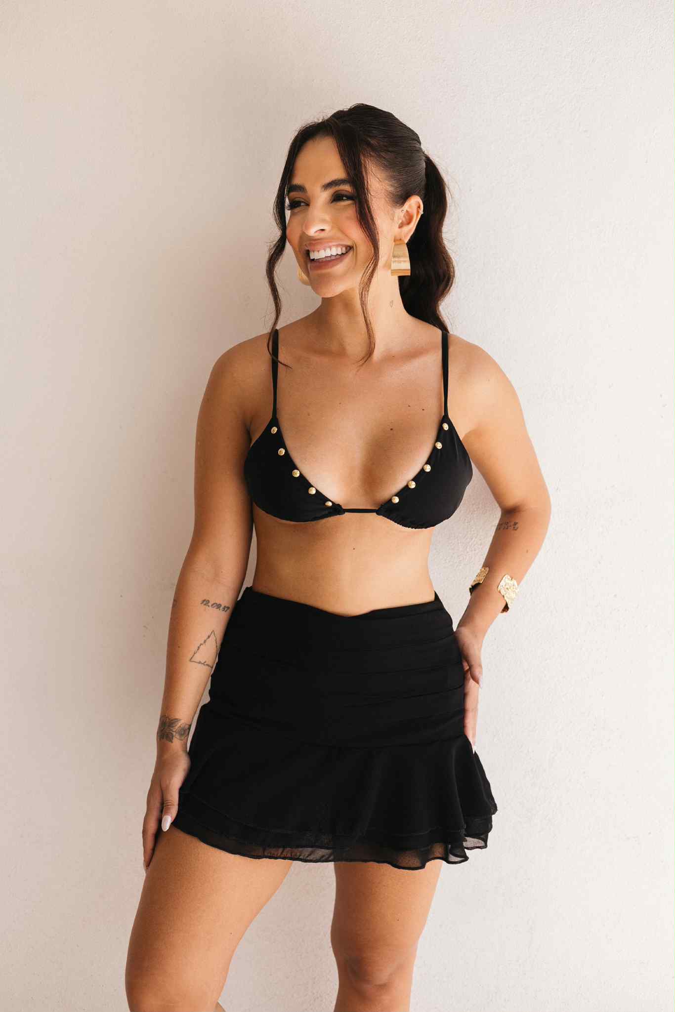 Saia curta drapeada de babados. Fechamento por zíper invisível nas costas.
